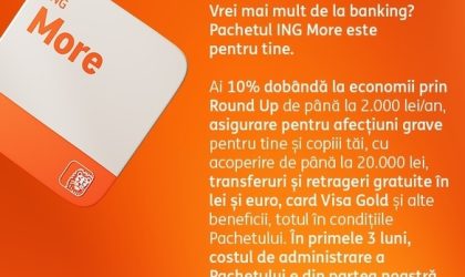 „În curând vei putea vedea în Home’Bank mai multe informații despre Pachetul tău: denumirea actuală, beneficiile incluse și, dacă dorești, vei putea să îți schimbi Pachetul direct din aplicație, într-un mod simplu și rapid. Astfel, vei vedea în Home’Bank alte două Pachete noi, ING More și ING Extra, create să se potrivească ritmului vieții tale și să-ți ofere libertatea de a-ți gestiona banii cum vrei. Vei găsi beneficii noi super atractive, cum ar fi schimb valutar avantajos fără limită de sumă și asigurarea de boli grave.”, transmit cei de la ING, tramiteau cei de la ING.