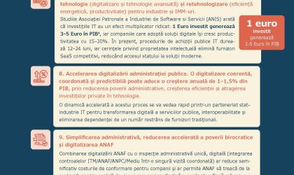 Studiile Asociaţiei Patronale a Industriei de Software si Servicii (ANIS) arată că investițiile IT au un efect multiplicator ridicat: 1 Euro investit generează 3–5 Euro în PIB4, iar companiile care adoptă soluții digitale iși cresc productivitatea cu 15–30%. In prezent, procedurile de achiziții publice IT durează 12–24 luni, iar cerințele privind proprietatea intelectuală elimină furnizori SaaS competitivi, reducand accesul statului la soluții moderne.