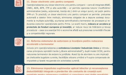 Operaționalizarea unui dosar electronic unic pentru companii – care să integreze ANAF, ONRC, ADR, AFM, ITM și alte autorități – ar permite operarea tuturor modificărilor administrative (sediu, acționariat, licențe etc.) dintr-un singur punct, cel puțin pentru IMM-uri. In practică, un dosar electronic unic pentru companii ar permite: preluarea automată a datelor intre instituții, eliminarea obligației de a depune aceleași documente la multiple autorități, scurtarea semnificativă a termenelor de procesare și reducerea costurilor operaționale pentru firme. La scară macro, măsura ar accelera și proiectele de fonduri europene și investiții, ar reduce riscul de intarziere și blocaj procedural – ceea ce e esențial intr-o economie aflată sub presiunea consolidării fiscale și a competitivității regionale. Reforma sistemului de autorizare și licențiere pentru reducerea accelerată a termenelor inclusiv prin operaționalizarea și extinderea Licențelor Industriale Unice și introducerea principiului aprobării tacite („tăcere administrativă”), după model OCDE, pentru reducerea termenelor de avizare la jumătate. Acest tip de abordare nu are implicații pe cheltuielile bugetare curente, facilitățile viitoare urmand a fi supra-compensate de impozitele și taxele recuperate din activitatea curentă.