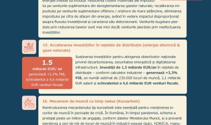 Eliminarea impozitului pe cifra de afaceri aplicat companiilor energetice și reanalizarea fiscalității in upstream și distribuție ar avea ca efect deblocarea investițiilor, creșterea predictibilității financiare și reducerea costurilor finale ale energiei. Sectorul petrolier și al gazelor naturale se confruntă cu o presiune fiscală fără precedent, generată de un număr de peste 44 de acte normative adoptate în ultimii 10 ani, care au ridicat rata efectivă de impozitare la de patru ori media europeană. Această supraincărcare fiscală a incetinit numeroase proiecte din onshore, offshore sau mare adancime, costurile de extracție cresc, reducand competitivitatea Romaniei in raport cu țări din regiune. O recalibrare a fiscalității in acest sector al energiei trebuie să includă: reducerea cotelor maximale ale impozitului pe veniturile suplimentare din dereglementarea gazelor naturale; recalibrarea impozitului pe veniturile suplimentare offshore / onshore de mare adancime, eliminarea impozitului pe cifra de afaceri din energie, avand in vedere impactul disproporționat asupra fluxului investițional și caracterul său distorsionant. Veniturile bugetare pierdute prin reducerea taxelor sunt mai mici decat veniturile pierdute prin neefectuarea investițiilor.