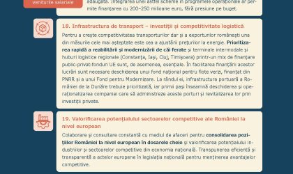 Pentru a crește competitivitatea transporturilor dar și a exporturilor romanești una din măsurile cele mai așteptate este cea a ajustării prețurilor la energie. Prioritizarea rapidă a reabilitării și modernizării de căi ferate și terminale intermodale și huburi logistice regionale (Constanța, Iași, Cluj, Timișoara) printr-un mix de finanțare public-privat-fonduri UE sunt, de asemenea, esențiale. In facilitarea finanțării acestor lucrări sunt necesare deschiderea unui fond național pentru flote verzi, finanțat din PNRR și a unui Fond pentru Modernizare. La randul ei, infrastructura portuară a Romaniei de la Dunăre trebuie prioritizată, iar primii pași inseamnă deschiderea și operaționalizarea companiei care să administreze aceste porturi și revitalizarea lor prin investiții private.