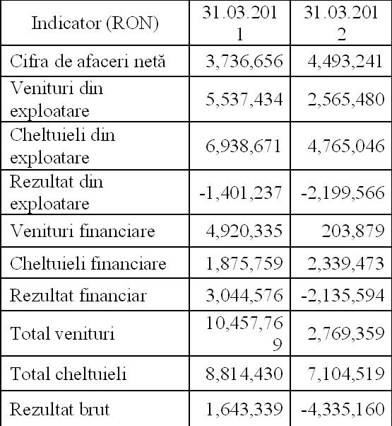 Rezultatele realizate arată o pierdere de 4.335.160 lei, cu circa 2 milioane lei mai mare decât pierderea bugetată. Astfel, indicatorii financiari aferenţi situaţiilor financiare neconsolidate şi neauditate, la data de 31.03.2012 sunt următorii: