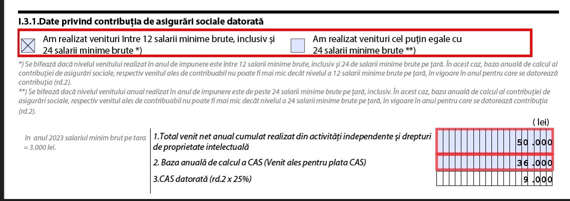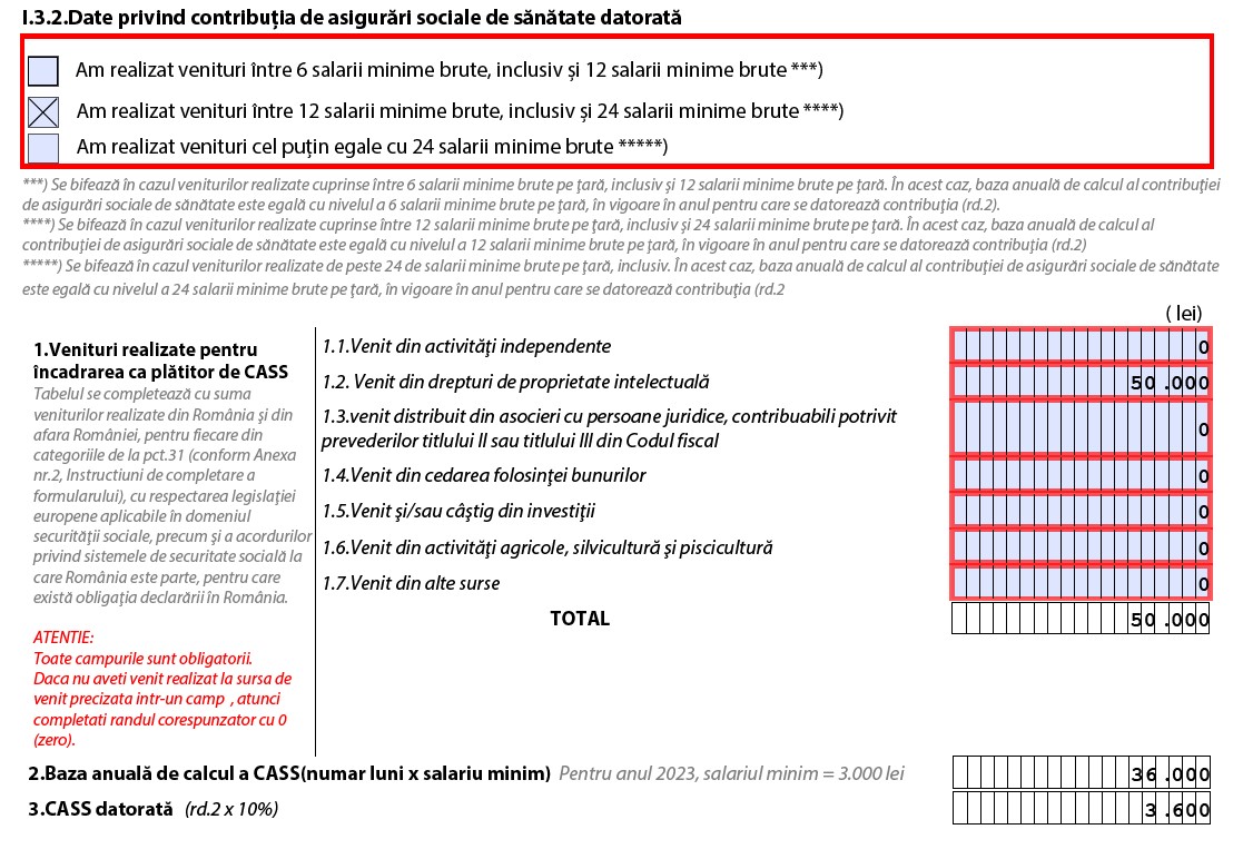 Pentru exemplificare, vom completa declaraţia pentru o persoană care a avut doar venituri din drepturi de proprietate intelectuală, dintr-o singură sursă (un singur plătitor de venit), în valoare netă anuală de 50.000 de lei în 2023. Pentru această persoană s-au reţinut şi plătit la ANAF contribuţiile sociale, lunar, prin declaraţia 112. Pentru primele nouă luni din 2023 contribuţiile i-au fost calculate asupra salariului minim brut în vigoare în acea perioadă, respectiv la 3.000 de lei, în timp ce pentru ultimele trei luni din an CAS şi CASS i-au fost calculate la nivelul salariului minim brut de 3.300 de lei, în vigoare începând cu octombrie 2023.