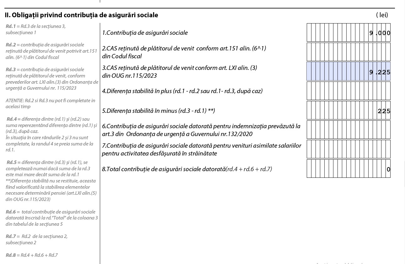Veţi completa CAS reţinută de plătitorul de venit conform articolului LXI din OUG 115 din 2023. Mai precis, veţi scrie 9.225 de lei în dreptul rândului al treilea dacă plătitorul a reţinut CAS în primele nouă luni din 2023 aplicată asupra salariului minim de 3.000 de lei, iar în ultimele trei luni a reţinut CAS aplicată asupra salariului minim de 3.300 de lei, conform analizei Economica.net.