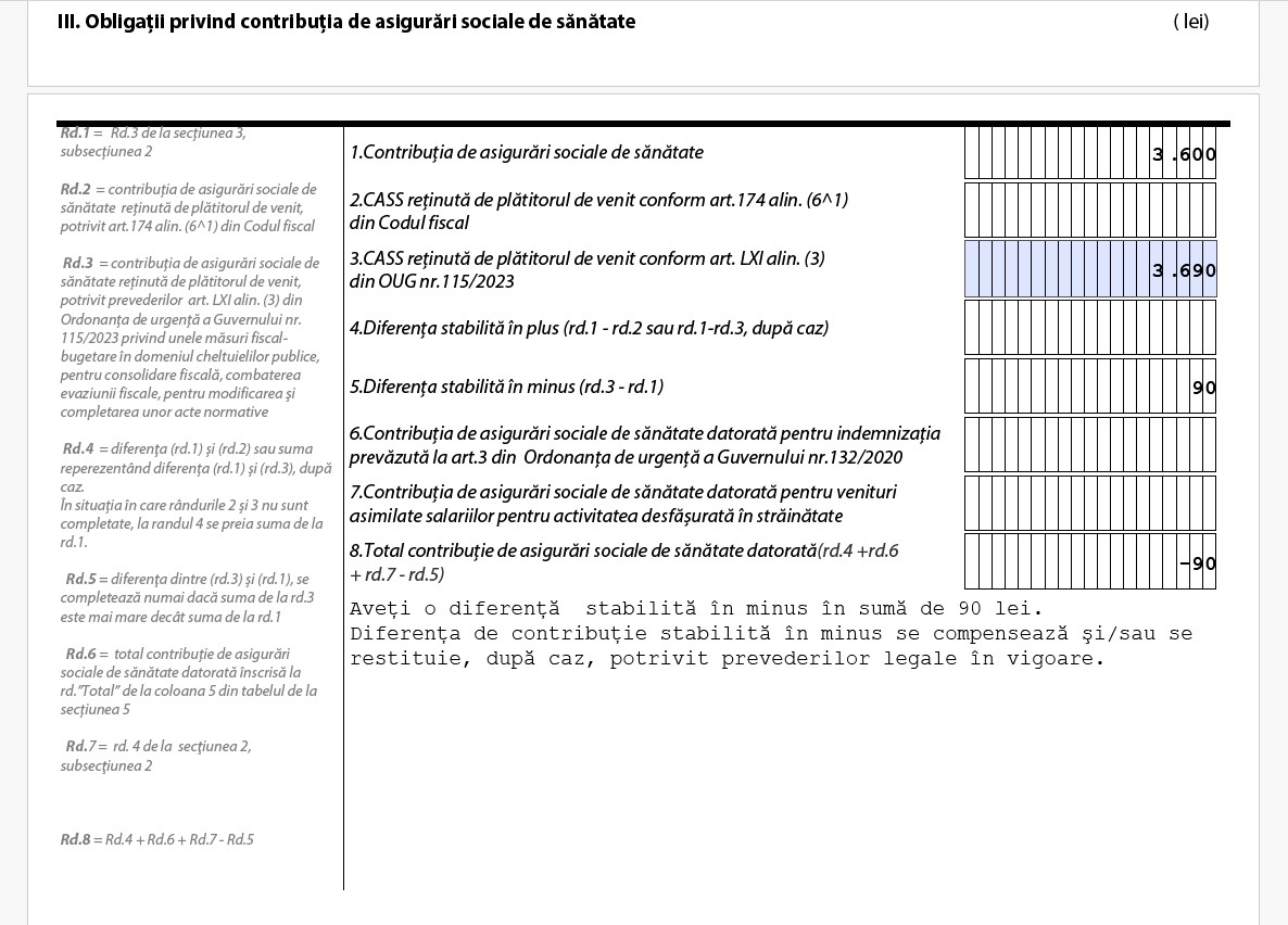 Veţi completa CASS reţinută de plătitorul de venit conform articolului LXI din OUG 115 din 2023. Mai precis, veţi scrie 3.690 de lei în dreptul rândului al treilea dacă plătitorul a reţinut CASS în primele nouă luni din 2023 aplicată asupra salariului minim de 3.000 de lei, iar în ultimele trei luni a reţinut CASS aplicată asupra salariului minim de 3.300 de lei, potrivit analizei Economica.net.