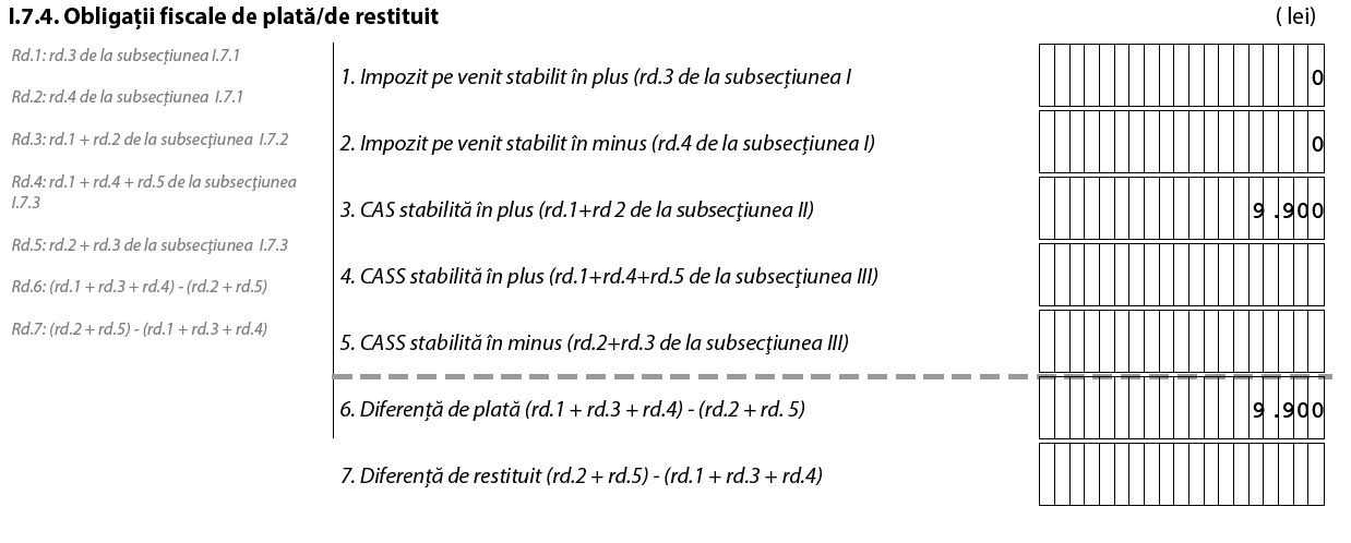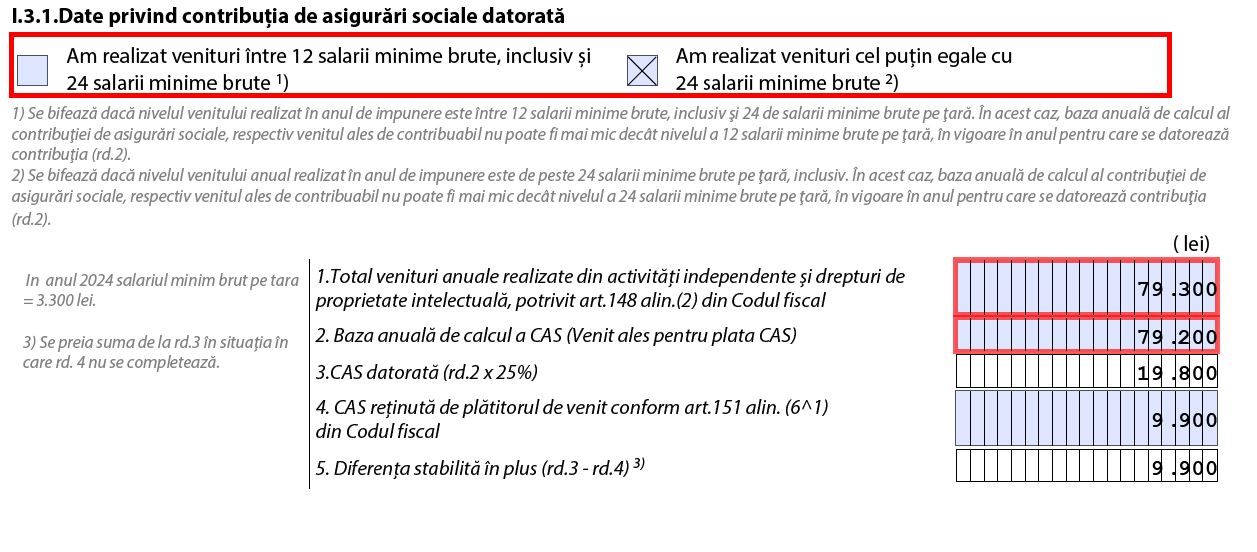 Exemplu de completare a declaraţiei unice pentru plata diferenţei de CAS datorate pentru veniturile din 2024
