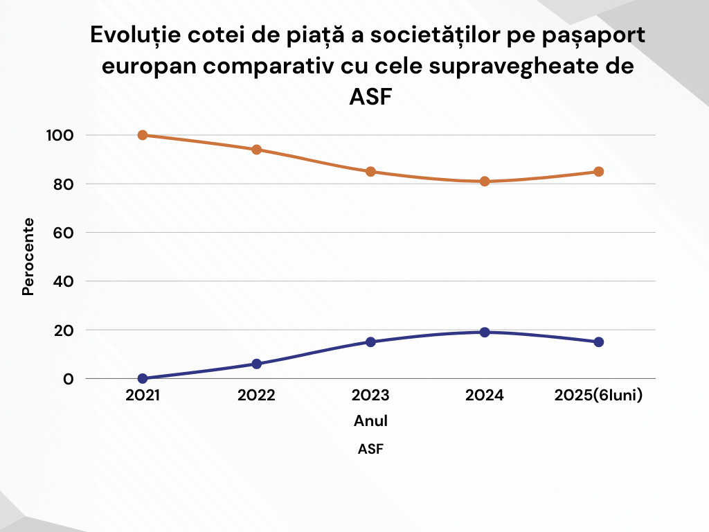 Grafic 1 Cota de piață a Axeria și Hellas a atins un maxim de aproape 20% în 2024, prima explozie având loc în 2023, anul falimentului Euroins. Cu portocaliu societățile supravegheate de ASF, cu albastriu cele două societăți prezente pe FOE