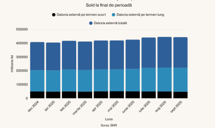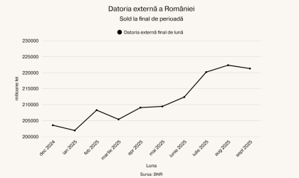 Datoria externă a României se situa, la finalul lunii septembrie 2025, la circa 221,3 miliarde de euro, în scădere cu aproape un miliard de euro față de 30 august. Este doar a doua oară când datoria externă scade de la o lună la alta, cealaltă diminuare fiind în luna martie, după cum se poate vedea în graficele de mai jos.