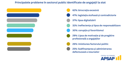 Birocrația excesivă, legislația stufoasă și lipsa digitalizării sunt cele mai mari probleme ale sectorului public, pe care angajații la stat le-au identificat în instituțiile în care lucrează, conform Centrului de Formare APSAP care a realizat un sondaj național la care au participat 4.743 de angajați din sectorul public, pentru a semnala dificultățile reale cu care se confruntă personalul din instituțiile statului.