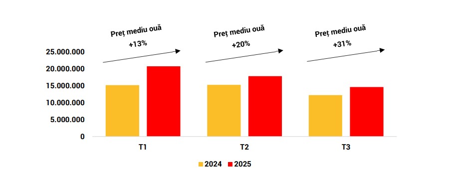 În al treilea trimestru al anului, Agroland a reușit să valorifice producția de ouă de consum la un preț mediu cu 31% mai mare comparativ cu aceeași perioadă a anului 2024, potrivit unui anunț al companiei. Este cea mai mare creștere din acest an raportat la perioada similară a anului trecut, în condițiile în care T1 creșterea a fost de 13%, iar în T2 de 20%.