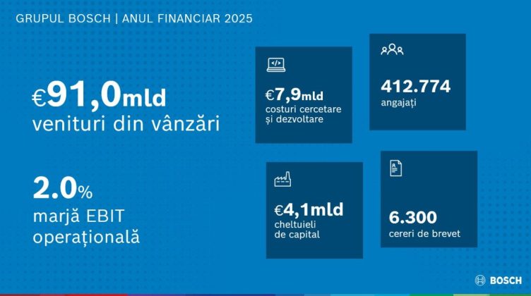 Grupul german Bosch, cu ample activități în România, a realizat anul trecut la nivel mondial venituri din vânzări de 91 mld. euro și estimează o creștere cu 2% - 5% în 2026. Totodată marja operațională va crește pe măsură ce vor fi aplivate măsuri drastice de reducere a costurilor care includ și disponibilizări xde personal.