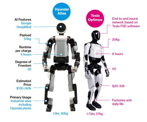 Pentru producătorii de automobile precum Tesla și Hyundai, roboții umanoizi utilizează componente asemănătoare cu cele ale mașinilor electrice — sunt alimentați de baterii, acționați de motoare electrice, ghidați de senzori și inteligență artificială. Acest lucru le permite să-și folosească experiența tehnologică și capacitatea de producție pentru a obține un avantaj pe o piață care, potrivit estimărilor Morgan Stanley, ar putea ajunge la o valoare de cinci mii de miliarde de dolari până în 2050, când ar putea exista peste 1 miliard de roboți umanoizi în uz.