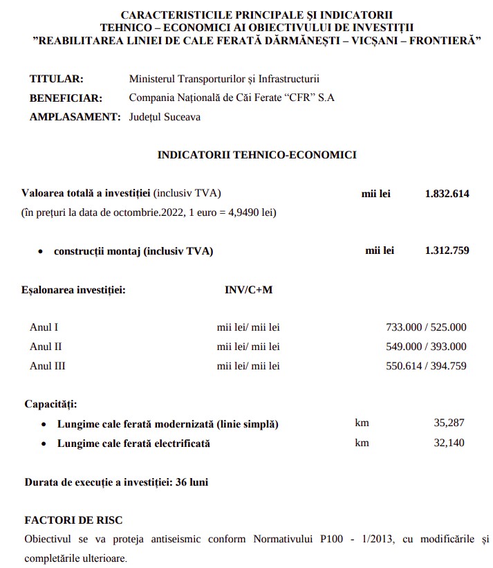 Printr-un proiect de act normativ, MTI propune aprobarea indicatorilor tehnico-economici ai obiectivului de investiţii „Reabilitarea liniei de cale ferată Dărmăneşti – Vicşani – Frontieră”, lucrare de utilitate publică de interes național, prevăzuţi în anexa care face parte integrantă din prezenta hotărâre. Obiectivele principale ale proiectului sunt următoarele: