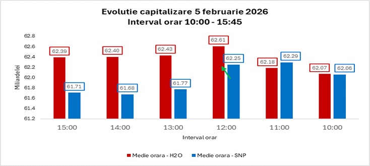 În cadrul ședinței de tranzacționare din 5 februarie 2026, acțiunea Hidroelectrica a înregistrat o apreciere de aproximativ 14% față de luna septembrie 2025. Această evoluție pozitivă s-a reflectat direct în capitalizarea bursieră a companiei, care a crescut cu aproximativ 7,7 miliarde de lei, de la 54,7 miliarde de lei la 62,4 miliarde de lei.