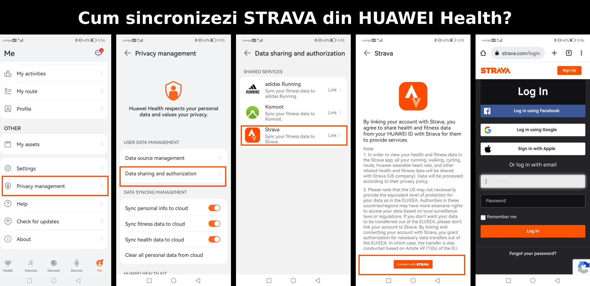 Sincronizarea aplicației Health cu Strava se face prin conectarea la aplicația Huawei Health, selectarea opțiunii „eu”, urmând să se bifeze și opțiunea „Gestionarea confidențialității”, apoi „Partajare date și autorizare”, selectați ”Strava”, apoi „Conectare cu Strava” și veți fi direcționat către website-ul Strava, unde va trebui să introduceți detaliile contului Strava și să vă conectați; permiteți aplicației Health să se conecteze la contul Strava, apăsând pe „Autorizează” și gata.