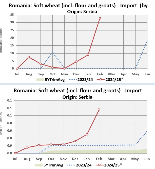Mai exact, în perioada analizată, importurile de grâu comun din Serbia au ajuns la aproximativ 58.000 de tone, fiind de cinci ori mai mari decât în perioada similară a anului trecut. Serbia a devenit astfel al doilea cel mai mare furnizori de grâu pentru România, după Republica Moldova care a făcut livrări de 285.000 de tone, cu 15,7% sub anul trecut.