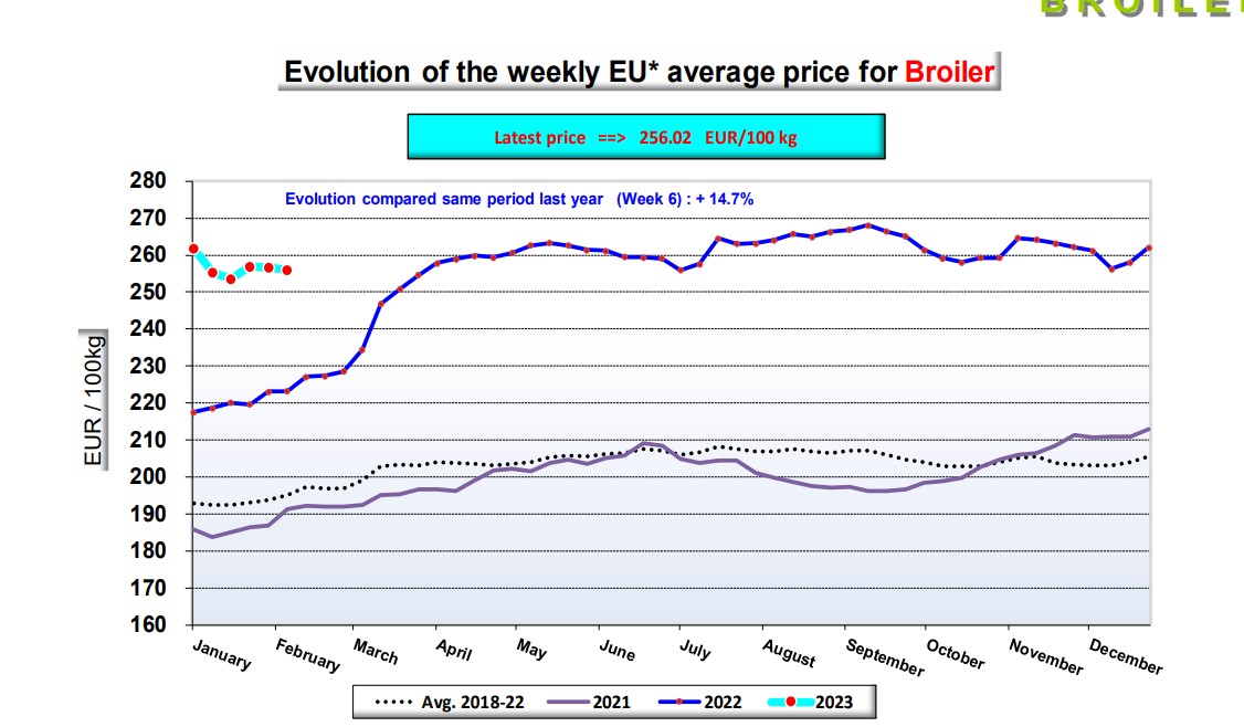 Exporturile de carne de pui din UE au scăzut cu 6,1% în 2022 și se estimează o scădere suplimentară în 2023 din cauza restricțiilor impuse din cauza focarelor de gripă și a competitivității scăzute a prețurilor în raport cu alți furnizori mondiali. Mai multe state precum Filipine, Coreea de Sud, Taiwan au interzis importurile de carne de pui din statele unde evoluează focare de gripă aviară.