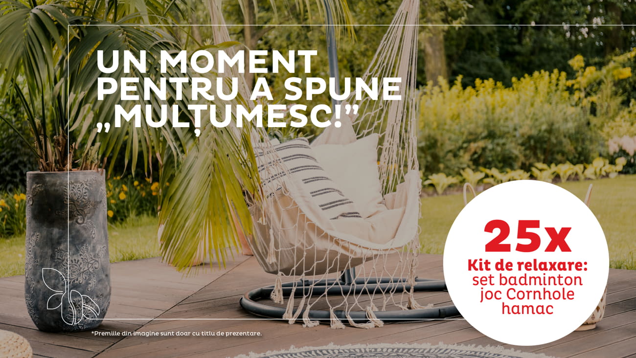 În plus, ești înscris și în tragerea la sorți a campaniei, unde ai ocazia de a câștiga unul dintre cele 25 de kit-uri care îndeamnă la crearea unor momente memorabile! Fiecare kit include un hamac perfect pentru relaxare, un joc Cornhole pe care îl poți încerca alături de cei dragi și un set de badminton, pentru distracție în doi.