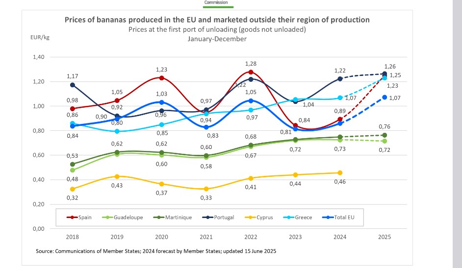 Cât despre bananele produse în Europa, prețul mediu înainte de îmbarcare a fost în ianuarie- aprilie la 120 de euro suta de kilograme, cu un preț mediu de 70 de euro în Cipru, 76 de euro în Guadeloupe (aparține Franței) și 83 de euro în Martinica. Cele mai scumpe banane produse în Europa vin din Portugalia și costă 164 euro suta de kilograme, conform datelor updatate în data de 15 iunie.