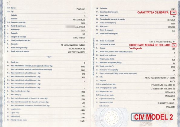 Modelul 3 de CIV – În acest document, capacitatea cilindrică este menționată la punctul 10, iar norma de poluare la punctul 5. Gradul de poluare este codificat prin ultimele două caractere ale numărului de omologare. Nu luați în calcul simbolul slash „/” și nici anul fabricației. Dat fiind că în exemplu este un vehicul din categoria M1, rezultă că avem un autoturism cu capacitatea cilindrică de 1461 cmc și norma de poluare Euro 4 (conform legendei din tabel E4 înseamnă Euro 4).