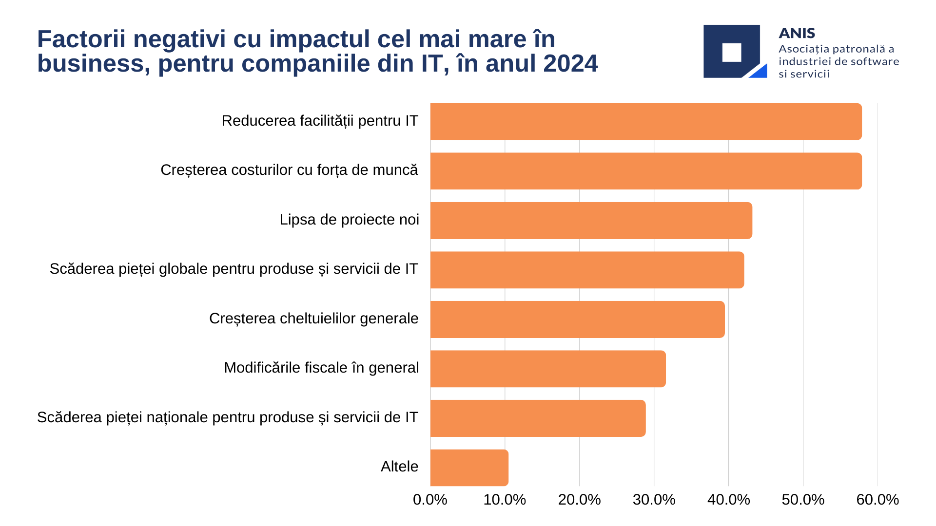 ”Industria IT din România continuă să se confrunte cu provocări generate de măsurile fiscale adoptate la sfârșitul anului 2023 și accentuate de deciziile fiscale intempestive de la finalul lui 2024. Deși companiile anticipează oportunități moderate de creștere, impredictibilitatea fiscală influențează puternic planurile pentru 2025”, se arată într-un comunicat al ANIS.