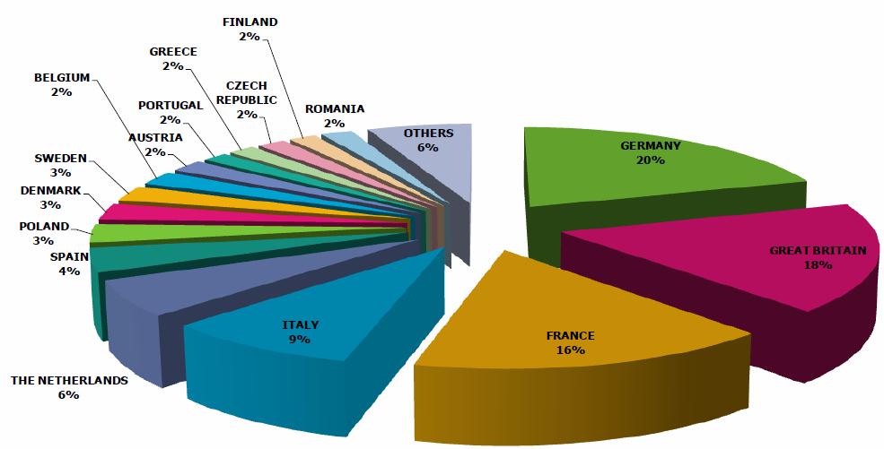 La capitolul vânzări de biciclete către consumatori, România deţine 2% (vezi graficul de mai jos) din piaţa Uniunii. Anul trecut, au fost vândute 375.000 de unităţi, în creştere cu faţă 2010, când au fost vândute 300.000 de biciclete.