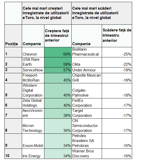 eToro a analizat care companii au înregistrat cea mai mare variație proporțională a numărului de deținători de la un trimestru la altul la nivel global (tabelul 1), analizând totodată și cele mai deținute 10 acțiuni de pe platformă (tabelul 2).