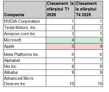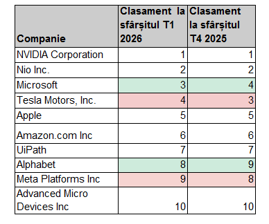 Selectivitatea în ceea ce privește investițiile în domeniul AI se observă și în clasamentul celor mai deținute acțiuni, care a rămas în mare parte stabil față de trimestrul trecut. Actorii majori din domeniul AI, precum Nvidia și Alphabet, au înregistrat schimbări minore în ceea ce privește numărul de deținători, în timp ce Microsoft a înregistrat o creștere de 11%, urcând de pe locul cinci pe locul patru.