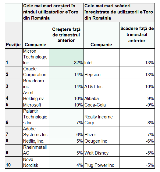 eToro a analizat, de asemenea, cele mai mari creșteri (tabelul 3) și cele mai deținute 10 acțiuni (tabelul 4) în rândul utilizatorilor din România. Investitorii individuali români au continuat să investească în tehnologie, Micron Technologies, un producător de memorii de mare viteză, înregistrând cea mai mare creștere a numărului de investitori de la un trimestru la altul (32%). Aceasta a fost urmată de Oracle (+14%), Broadcom (+14%), ASML (+10%) și Microsoft (+10%). Companiile din sectorul apărării Palantir (+7%) și Rheinmetall (+5%) au atras, de asemenea, atenția investitorilor. Primele 6 locuri sunt ocupate de companii legate de AI, una dintre temele de investiții preferate ale investitorilor români.