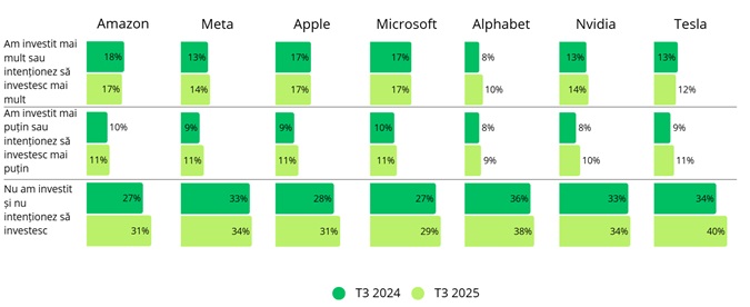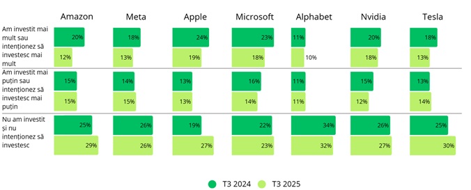 Datele au arătat că, față de anul trecut, numărul investitorilor care intenționează să-și reducă investițiile a crescut marginal pentru toate acțiunile din grupul celor „7 Magnifici”. Meta, Apple, Nvidia și Tesla au înregistrat fiecare o creștere de 2%, în timp ce restul companiilor au înregistrat o creștere de 1%. Investitorii individuali și-au redus, de asemenea, ușor expunerea la toate aceste acțiuni importante din sectorul de tehnologie american, remarcându-se în special faptul că numărul investitorilor care nu au investit sau nu intenționează să investească în Tesla a crescut cu 6%. Doar Meta, Alphabet și Nvidia au înregistrat o creștere marginală a proporției investitorilor care intenționează să își mărească participațiile.