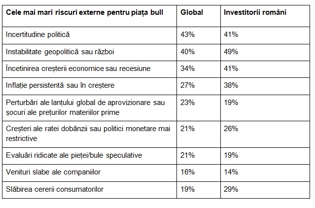 Ultimul raport Retail Investor Beat arată că investitorii consideră incertitudinea politică (43%), instabilitatea geopolitică sau războiul (40%) și încetinirea creșterii economice sau recesiunea (34%) ca fiind principalele riscuri externe pentru piața bull din 2026. Investitorii români sunt mai îngrijorați de instabilitatea geopolitică sau război (49%). De asemenea, aceștia sunt mai preocupați de riscurile de inflație și recesiune decât omologii lor din restul lumii.