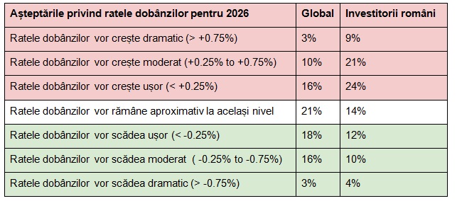 Majoritatea investitorilor anticipează modificări ale ratei dobânzii în 2026, 37% așteptându-se la o scădere și 29% la o creștere. Dintre cei care prevăd o scădere, 18% anticipează o reducere ușoară de până la 0,25%, în timp ce 16% se așteaptă la o scădere moderată între 0,25% și 0,75%.