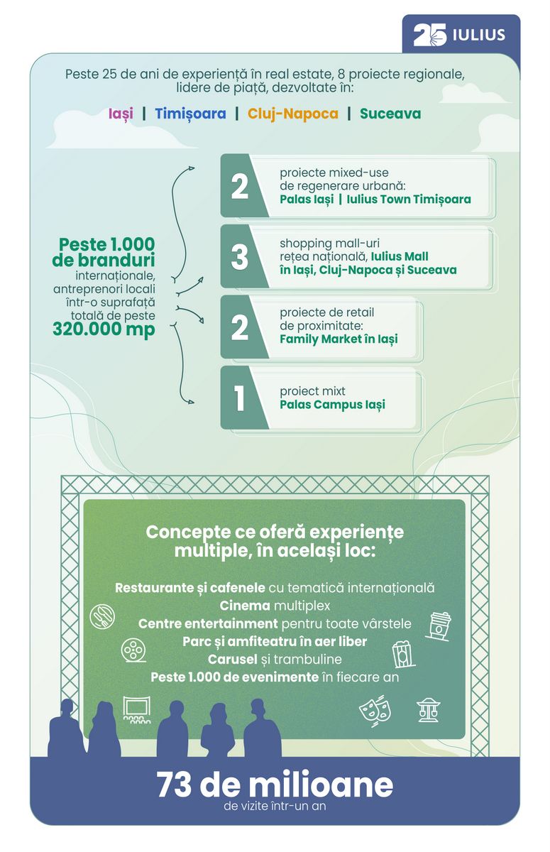 Portofoliul de retail al IULIUS include opt proiecte regionale, la Iași, Suceava, Cluj-Napoca și Timișoara, cu o suprafață totală de retail de peste 320.000 mp, în care sunt prezente peste 1.000 de branduri internaționale și antreprenori locali. „După un sfert de veac de activitate, putem spune că aproape nu există brand în România care să nu fie prezent în centrele noastre comerciale. Proiectele noastre sunt o destinație strategică pentru marile branduri de retail internaționale, multe dintre ele deschizând primele magazine din afara Capitalei în rețeaua Iulius. Faptul că, anual, înregistrăm 73 de milioane de vizite ne dovedește că facem parte din viața comunității, iar acesta este un obiectiv pe care ni l-am setat de la început. Acela de a construi nu doar clădiri frumoase, ci spații vibrante, în care fiecare membru al comunității se regăsește”, a spus Oana Diaconescu, Head of Retail Leasing IULIUS.