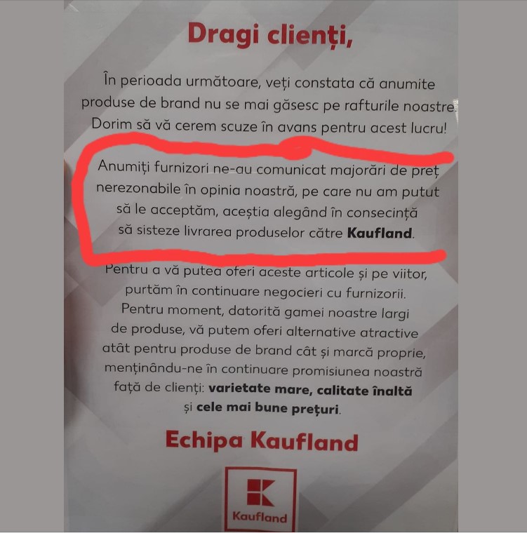 “În perioada următoare, veți constata că anumite produse de brand nu se mai regăsesc pe rafturile noastre. Dorim să vă cerem scuze în avans pentru acest lucru”, afirmă Kaufland într-un anunț distribuit și de Asociația pentru Protecția Consumatorilor din România, pe pagina sa de socializare, urmat de întrebarea „Așa o fi?”.