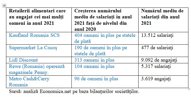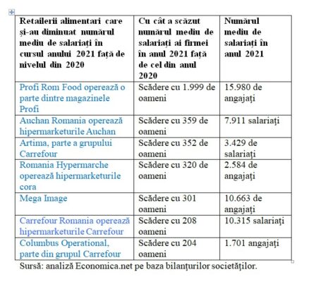 Majoritatea marilor retaileri alimentari din România şi-au redus efectivele de salariaţi în 2021, arată analiza Economica.net.