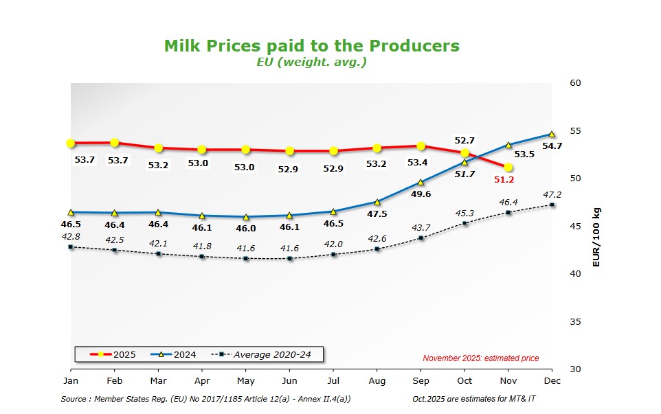 „Prețurile medii ale laptelui la poarta fermei în UE au înregistrat o volatilitate redusă în 2025 și s-au stabilizat la un nivel superior mediei pe 5 ani în prima jumătate a anului 2025, deoarece scăderea livrărilor a menținut prețurile laptelui în UE la un nivel ridicat. Cu toate acestea, acest lucru face ca producția europeană să fie mai puțin competitivă decât cea a altor producători mondiali importanți, ceea ce se preconizează că va influența negativ prețurile la poarta fermei din Europa în următoarele luni. Se preconizează un consum intern de lapte lichid cu 0,9% mai mic, până la 23 milioane de tone în 2026. Având în vedere scăderea producției de lapte în 2026, se preconizează că și consumul industrial va scădea minim cu 0,3 %. Acest lucru va obliga procesatorii de produse lactate să decidă cu atenție pentru ce produse vor utiliza laptele disponibil”, explică analiștii USDA, într-un raport recent.