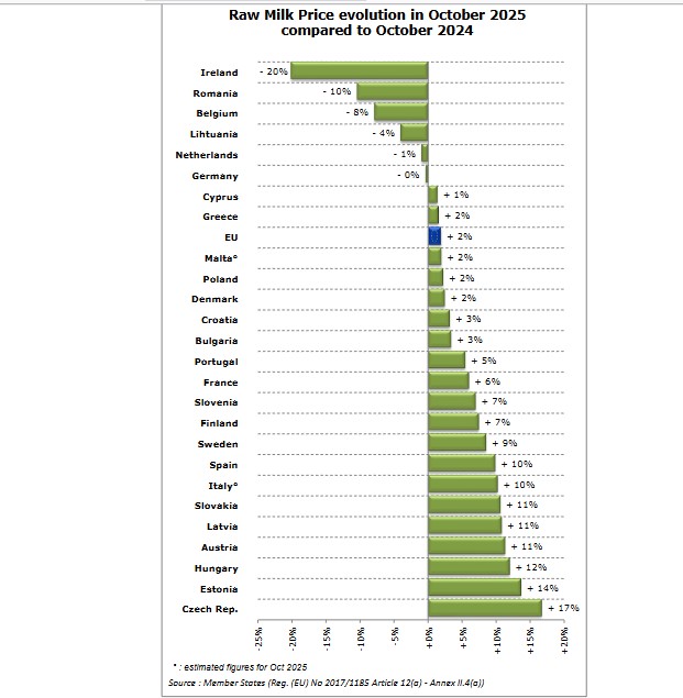 „Disponibilitatea furajelor s-a îmbunătățit în multe state membre ale UE în 2025, cu o creștere puternică a zonelor de pășunat și a culturilor furajere, în special a porumbului furajer, care prezintă un potențial bun de randament. Acest lucru a fost observat în Europa Centrală și de Est și în Irlanda, cu efecte pozitive asupra producției de lapte vizibile în special în Irlanda, unde dieta vacilor de lapte este predominant bazată pe iarbă. Cu toate acestea, lipsa apei continuă să afecteze negativ producția de furaje în sudul Franței, Ungaria, sudul României și Bulgaria, potrivit monitorizării culturilor efectuate de Comisia Europeană (CE). Pe lângă îmbunătățirea disponibilității furajelor, scăderea costurilor energiei și a îngrășămintelor a susținut marjele fermierilor”, mai notează USDA.