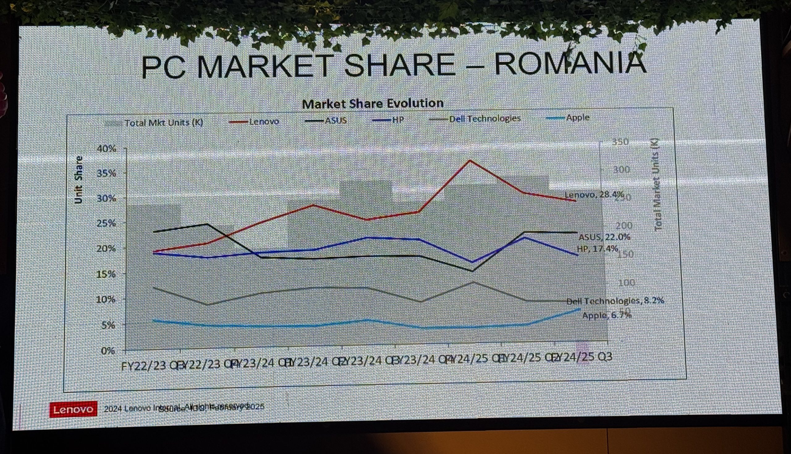 În ultimii ani însă, preferințele românilor pentru laptopuri au cunoscut câteva modificări importante. De exemplu, în anul fiscal 2022-2023, ASUS conducea detașat, cu o cotă de aproximativ 25%, iar Lenovo și HP se aflau practic la egalitate, ambele plutind în jurul a 20-21% din piață.