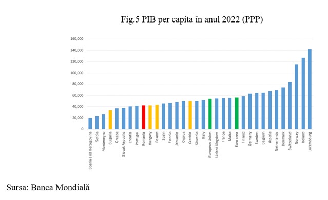 Interesantă și totodată relevantă din această comparație între metode este și observația că, atunci când ajustăm cu nivelul diferit al prețurilor (așadar când facem trecerea de la PIB per capita exprimat în dolari SUA către PIB per capita ținând seama de PPP), România se clasează în 2022 peste Slovacia, Croația, Grecia și Portugalia, așa cum reiese din Figura 5 de mai jos (în opoziție cu imaginea oferită de graficul din dreapta al Figurii 4 de mai sus). Modificarea poziției României în clasament față de Grecia și Portugalia la schimbarea de metodă arată tocmai faptul că raportarea la PPP aduce un unghi nou (și totodată relevant) analizei, în special atunci când țările care sunt comparate au niveluri semnificativ diferite ale dezvoltării economice de ansamblu.