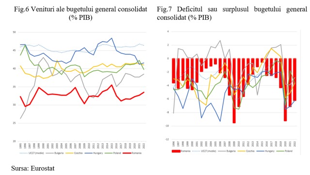 Observațiile formulate mai sus nu sunt însă specifice României. Însă, așa cum arată Figura 6 de mai jos, unul dintre elementele prin care România s-a singularizat în cadrul regiunii pe parcursul ultimilor 27 de ani a fost nivelul în permanență mai redus al veniturilor bugetului general consolidat (ca pondere în PIB) față de celelalte țări. Nu un an, nu cinci, nu zece, ci douăzeci și șapte de ani la rând, ponderea în PIB a veniturilor bugetului general consolidat a fost în cazul României semnificativ mai mică decât în Polonia, Ungaria și Cehia. Inclusiv în Bulgaria ponderea a fost în majoritatea acestei perioade mai ridicată față de România, cu excepția anilor 1995-1996 și 2011.