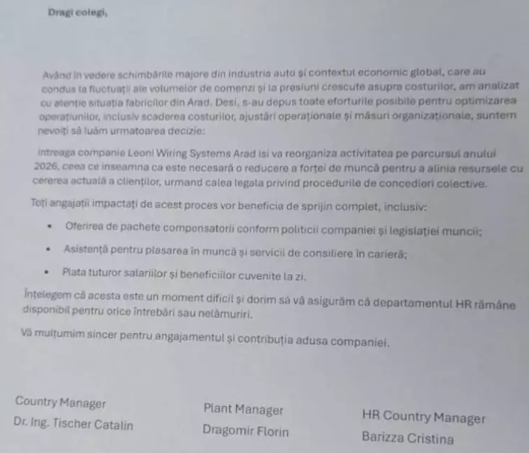 Leoni face concedieri la fabrica din Arad. Aproape 500 de angajați rămân fără loc de muncă în 2026
