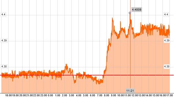 La ora 18:21, după ce piaţa de la Bucureşti a închis, cursul a spart şi pragul de 4,4 lei/euro la 4,4008, foarte aproape de nivelul de 4,4030 înregistrat în 27 iunie 2010 – după ce Curtea Constituţională respingea impozitarea pensiilor ca parte a măsurilor de austeritate propuse de guvernul Boc.
