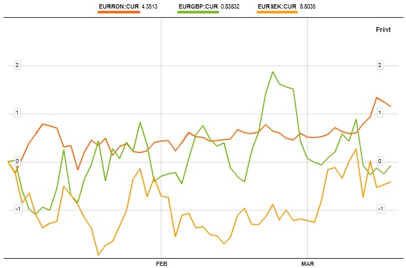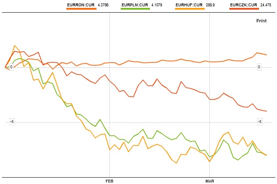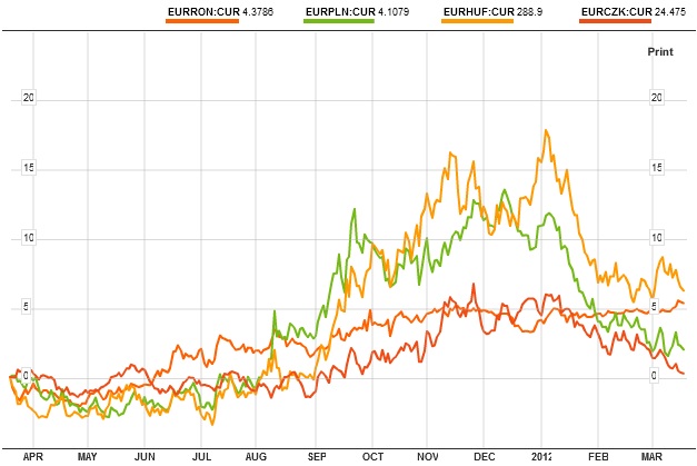 Forintul maghiar, zlotul polonez şi coroana cehă sunt mai puternice decât erau la începutul anului faţă de euro şi au fost astfel de peste două luni. Coroana suedeză şi lira sterlină, celelalte două monede din UE cu regim flotant, sunt, de asemenea, mai puternice faţă de euro decât la 1 ianuarie 2012.