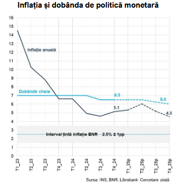 Libra se așteptă ca inflația să fluctueze pe parcursul anului 2025 peste marginea superioară de 3,5% a intervalului țintă de inflație (2,5%±1pp). Riscurile la adresa inflației se mențin destul de ridicate pentru perioada următoare, iar acestea derivă în general din: i) creșterea semnificativă a salariilor și pensiilor pe parcursul anului trecut în contextul menținerii unei oferte reduse, inclusiv a celei de natură alimentară având în vedere anul agricol slab 2024, ii) din ridicarea plafoanelor la energie începând cu 1 aprilie a.c și, nu în ultimul rând, iii) din procesul de consolidare fiscală și modul de implementare a acestuia.