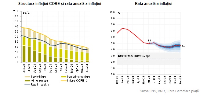i) Ritmul anual de creștere al prețurilor de consum a continuat să încetinească până la 4,94% în luna iunie, peste așteptările Băncii Centrale, în contextul atenuării dinamicii inflației de bază și a prețului combustibililor parțial contrabalansată de scumpirea gazelor naturale. Inflația anuală CORE2 ajustat și-a menținut tendința de decelerare rapidă în iunie, aceasta coborând la 5,7% de la 7,1% în martie 2024. Decelerarea a fost antrenată de efectele de bază dezinflaționiste, corecția descendentă a cotațiilor mărfurilor la care s-au adăugat temperarea prețurilor de import și calmarea așteptărilor inflaționiste pe termen scurt.