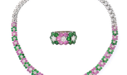 Un set din aur alb, format din colier și inel, decorat cu diamante, tsavorite și safire, este estimat la 6.000 – 7.000 de euro.