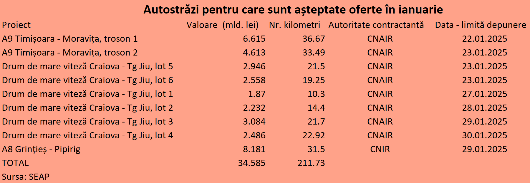 ECONOMICA.NET a realizat lista proiectelor de autostradă și drum expres pentru care mai sunt așteptate oferte până la sfârșitul lunii ianuarie, în baza datelor din Sistemul Electronic de Achiziții Publice (SEAP).