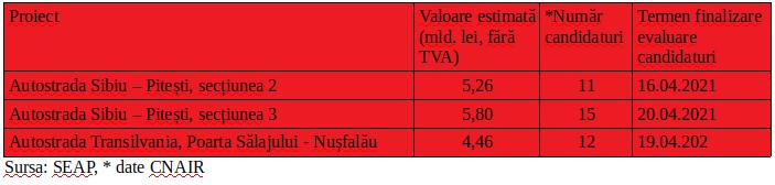 Compania de Drumuri ar putea selecta până la finele lunii aprilie candidații care vor rămâne în cursa pentru construcția secțiunilor 2 și 3 din Autostrada Sibiu – Pitești și a tronsonului din Autostrada Transilvania care include Tunelul Meseș. Valoarea estimată a contractelor pentru cele mai grele loturi de autostradă din România depășește 15 miliarde de lei.