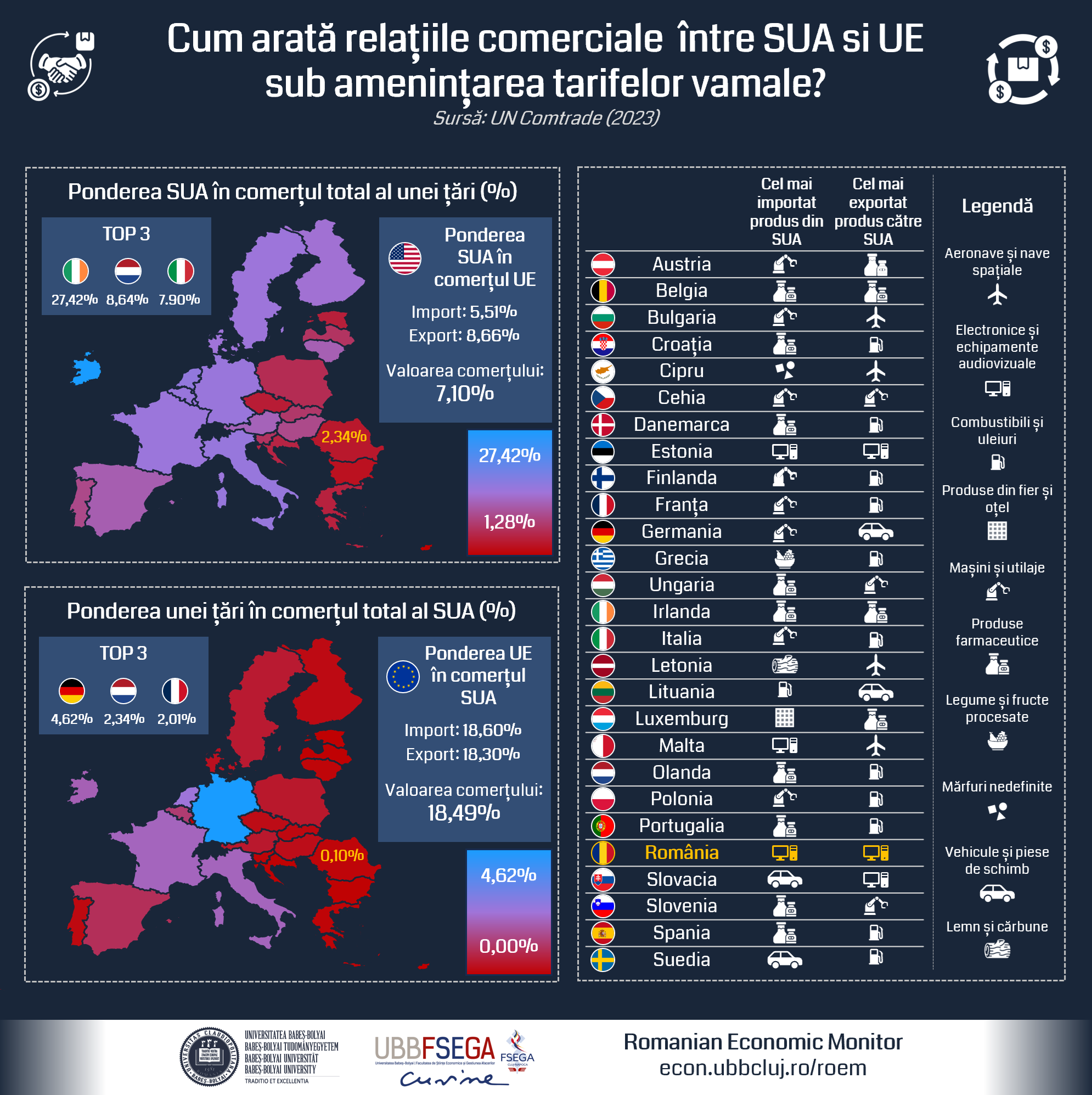 Analizând structura comerțului extern al României, analiștii RoEM precizează că SUA reprezintă doar 2,34% din totalul comerțului extern al țării, care include atât exporturile, cât și importurile. Invers, situația este similară, România având o pondere de doar 0,10% din totalul comerțului extern al SUA. Totuși, avertizează aceștia, ”concluzia că aceste tarife vamale vor avea un impact nesemnificativ asupra economiei României este una eronată”.