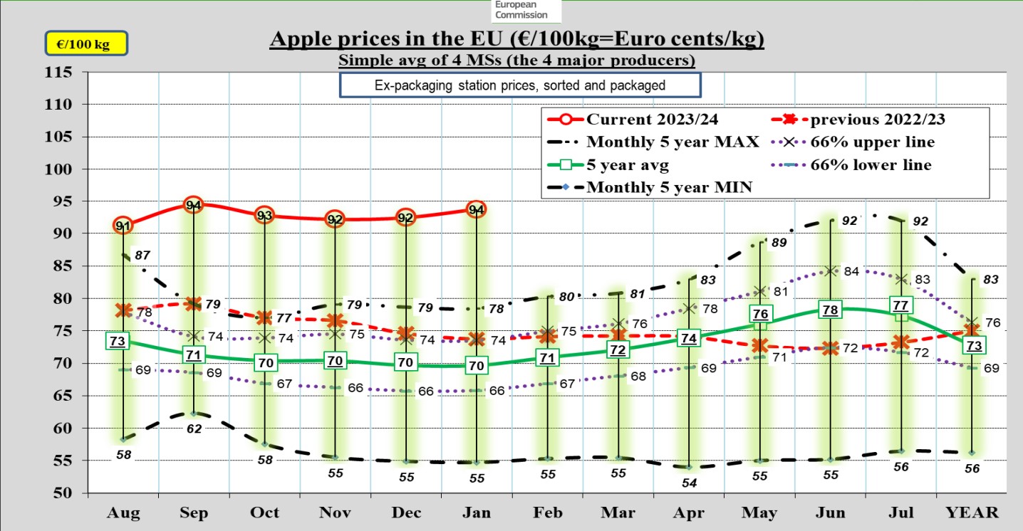 România se înscrie astfel pe același trend ascedent, ca și restul Europei, cu mențiunea că majorările din România sunt superioare celor din UE. Prețul mediu în UE a ajuns la 94,43 de eurocenți față de 78,12 eurocenți cu un an în urmă (plus 20,7%). Cele mai scumpe mere din blocul comunitar se regăsesc în Franța, care este și al treilea cel mai mare producător. Prețul mediu a ajuns acolo în luna ianuarie la 136,2 eurocenți, după un salt de 8,7%. La polul opus, cu cele mai ieftine mere, este Belgia unde kilogramul pleacă de la centrul de ambalare cu 46,7 eurocenți, sub prețul de 49,13 din ianuarie 2023.